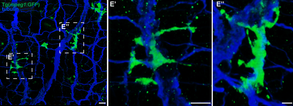 Intestinal macrophages are tightly bundled with neural processes in the muscularis as well as in the mucosal region in the developing and adult zebrafish. We are investigating whether intestinal macrophages affect gut-brain communication.